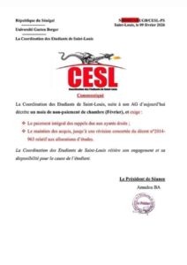 Dans un communiqué officiel signé par le président de séance, Amadou Ba, la CESL explique cette décision par la persistance de difficultés liées aux allocations d’études. Deux principales revendications sont mises en avant : le paiement intégral des rappels dus aux étudiants concernés et le maintien des acquis sociaux jusqu’à une révision concertée du décret n°2014-963 portant sur les allocations d’études.